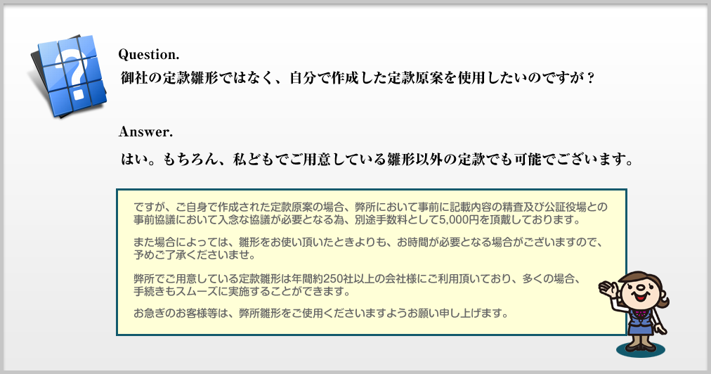 電子定款認証代行.comのサービスは、弊所作成の定款雛形をご使用頂くこととなっております。